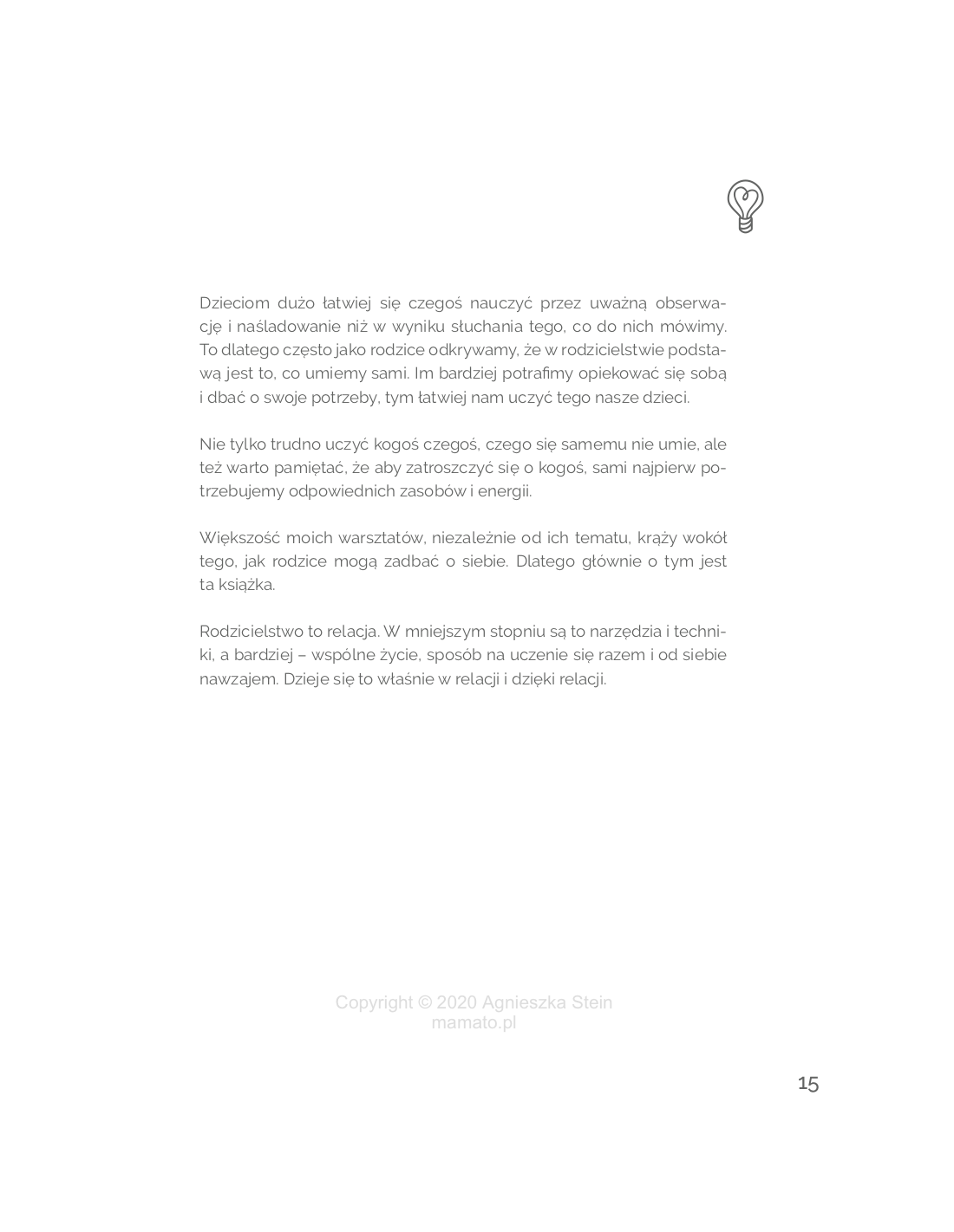 Znajdziesz w nim dużo przestrzeni na własne przemyślenia i pracę ćwiczeniową w obszarach rodzicielskich, a także chwilę na rozluźnienie i sprawdzenie, jak się masz w swoim ciele. Odrobina wiedzy pomoże Ci lepiej zrozumieć zagadnienia, nad którymi będziesz pracować. A otwarta forma ćwiczeń i obszarów do kolorowania sprawi, że będzie to przyjemna praca.