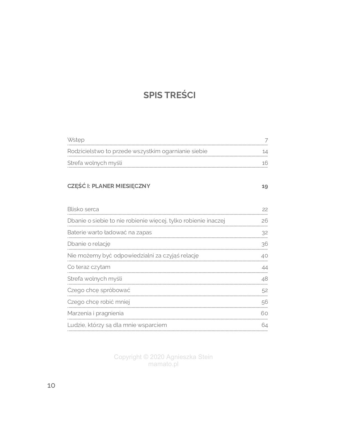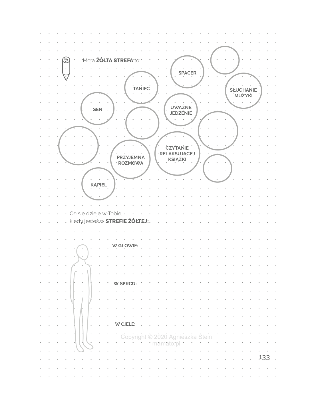 Znajdziesz w nim dużo przestrzeni na własne przemyślenia i pracę ćwiczeniową w obszarach rodzicielskich, a także chwilę na rozluźnienie i sprawdzenie, jak się masz w swoim ciele. Odrobina wiedzy pomoże Ci lepiej zrozumieć zagadnienia, nad którymi będziesz pracować. A otwarta forma ćwiczeń i obszarów do kolorowania sprawi, że będzie to przyjemna praca.