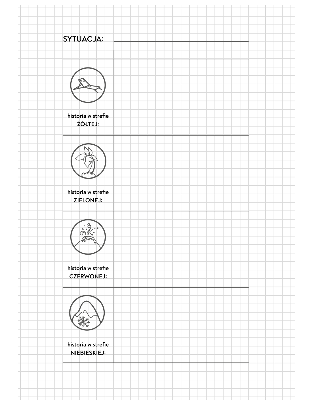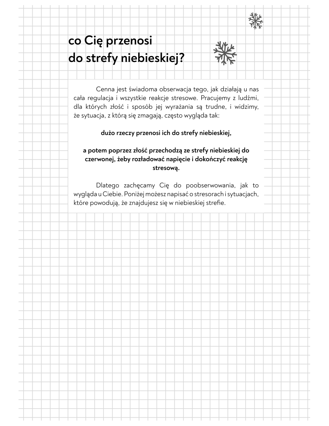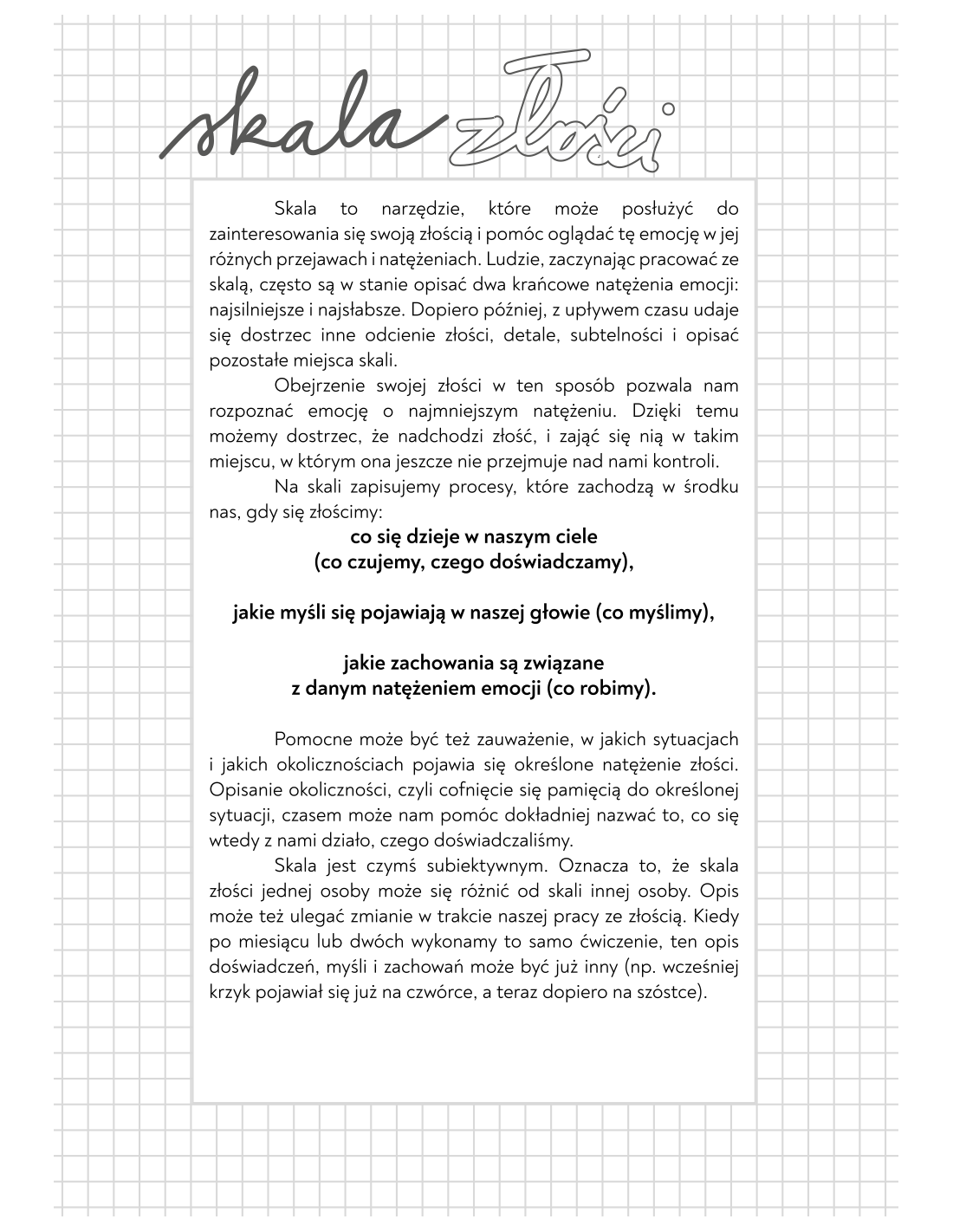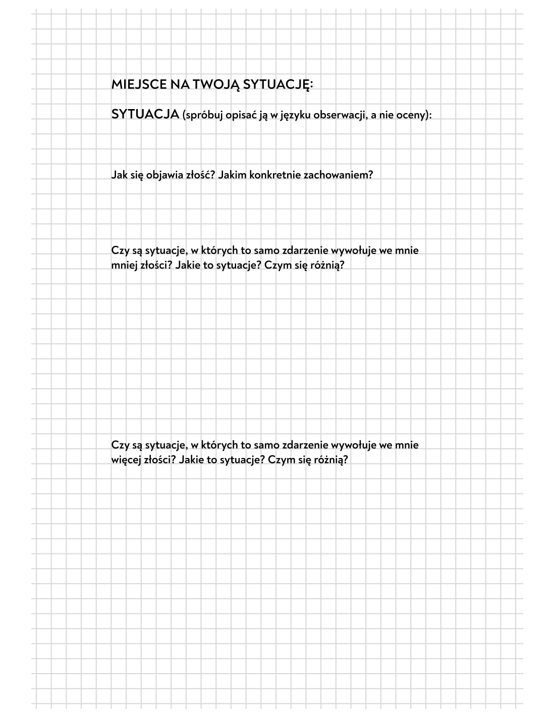 Jest to narzędzie pracy warsztatowej do samodzielnego wypełniania, mające na celu wspierać Cię w codziennej praktyce zaprzyjaźniania się z Twoja złością.
